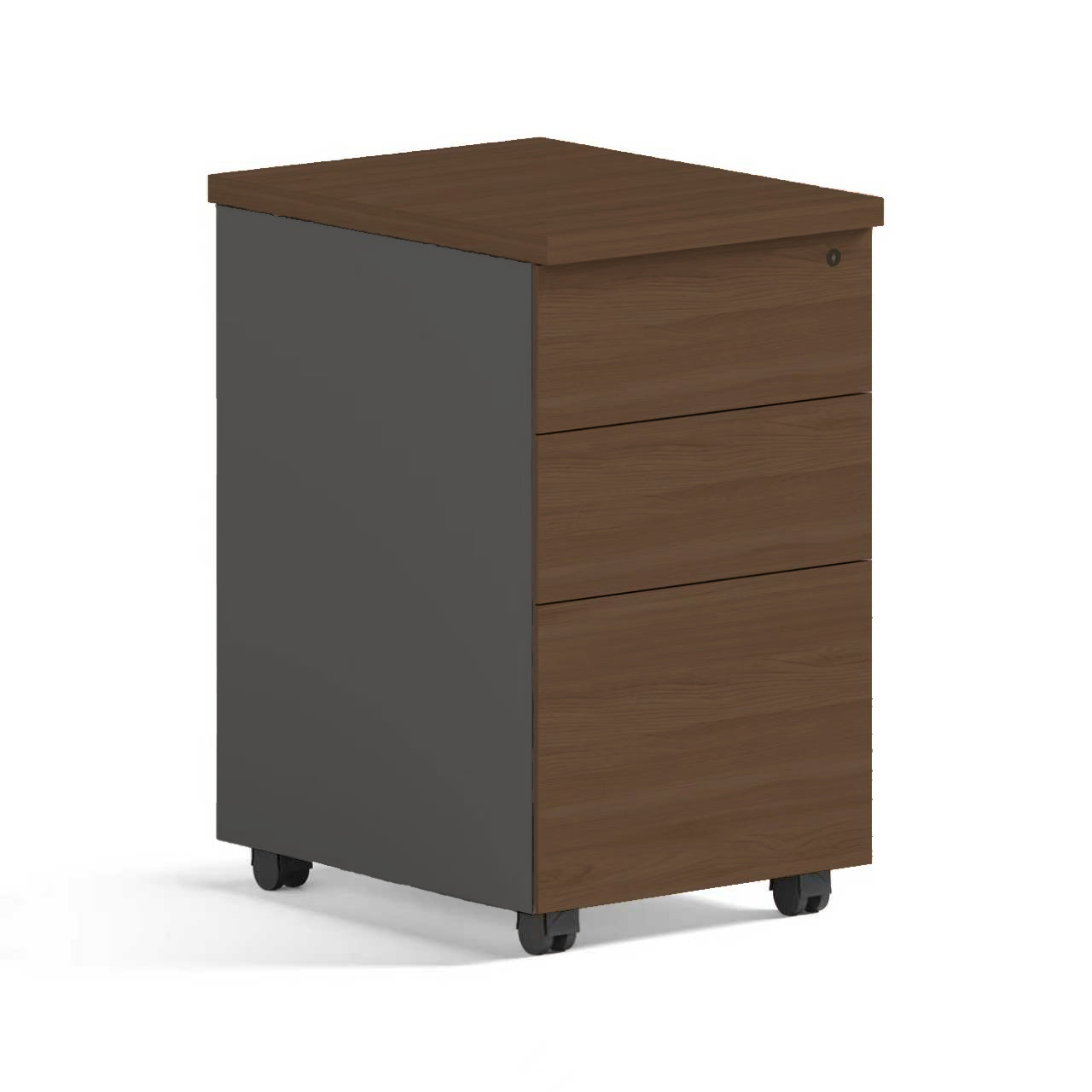 Kompaktowy kontener do biurka w stylu loft. Trzy pojemne szuflady pomagają zapanować nad dokumentami i akcesoriami, a kółka umożliwiają szybkie przestawienie pod lub obok stanowiska.