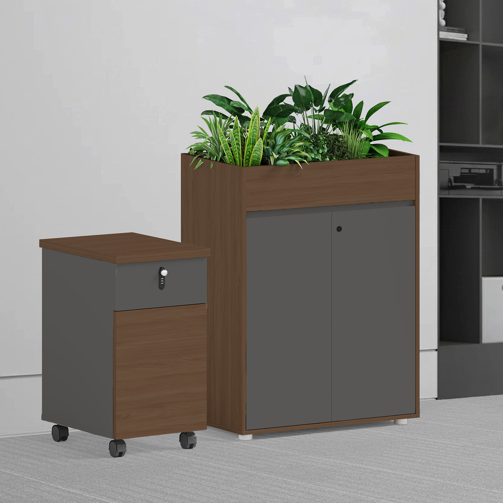 Wielofunkcyjny mebel do open space: górne koryto na doniczki i pojemna szafka poniżej. Zapewnia prywatność między stanowiskami i wprowadza naturalną zieleń, podnosząc komfort pracy i estetykę biura.